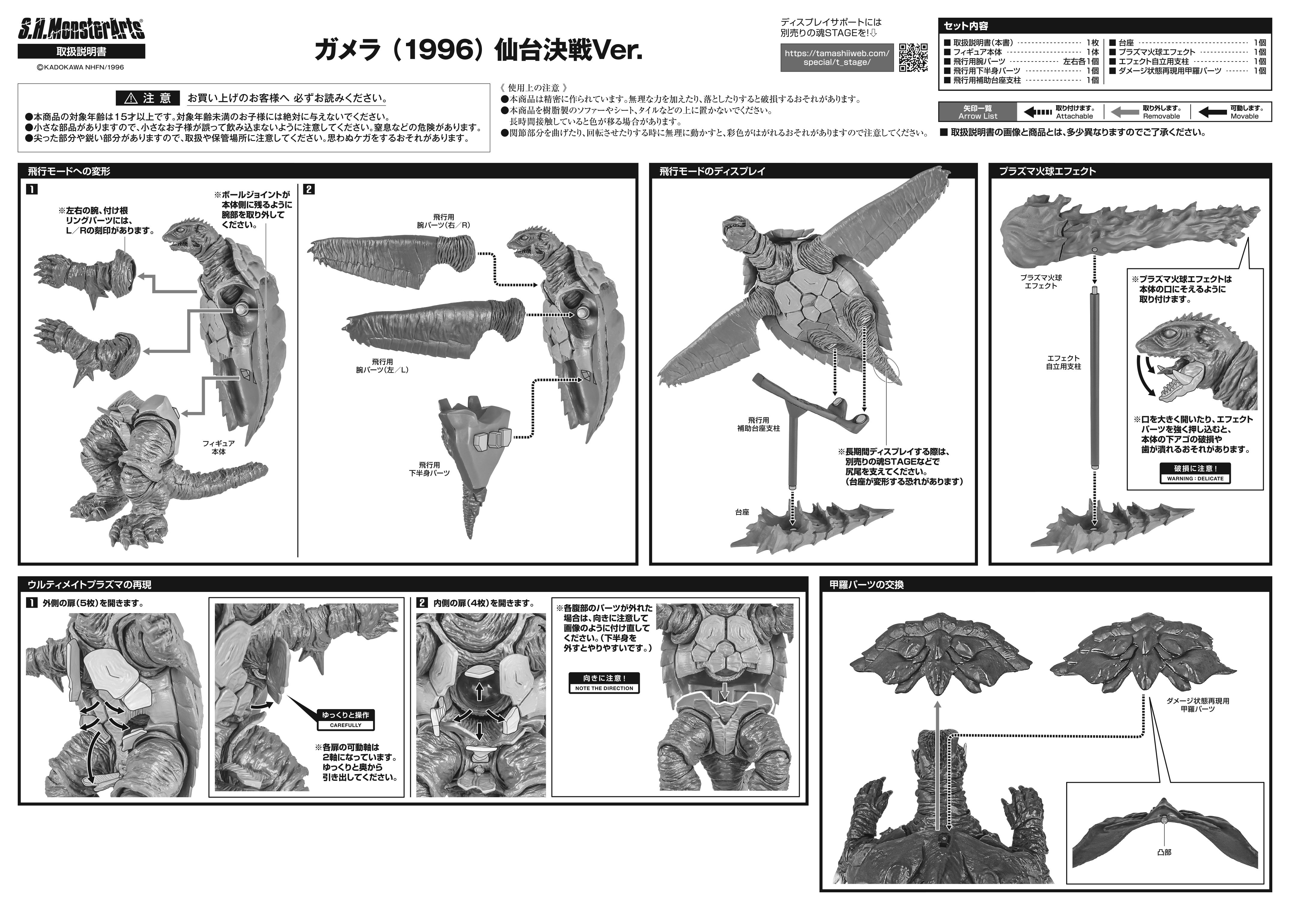 From "Gamera 2: Legion Attacks", S.H.MonsterArts Gamera (1996) has been repainted as the Sendai Decisive Battle Ver., which allows you to recreate its damaged state. The prototype was created by Shinichi Wakasa and Tomoo Haraguchi, who have been involved in the creation of many monsters, and sculpted in great detail. In addition, a new swappable damaged shell piece is included, which allows you to recreate the damage in the battle against Legion.