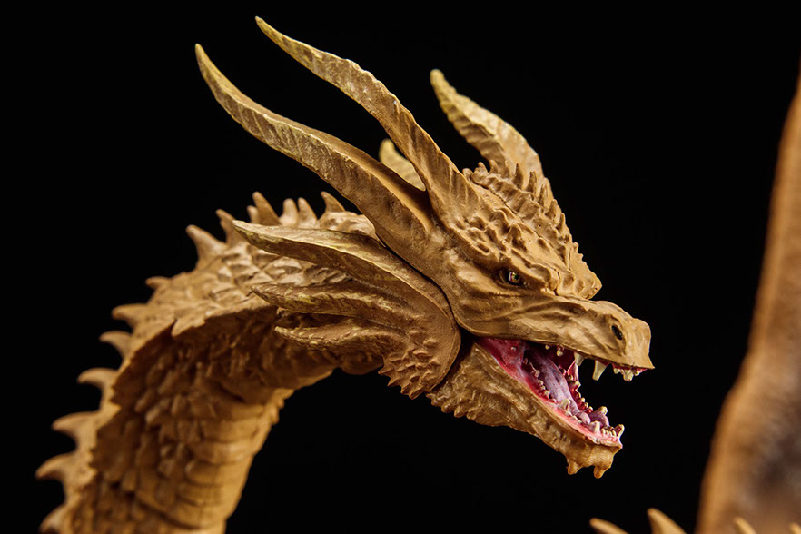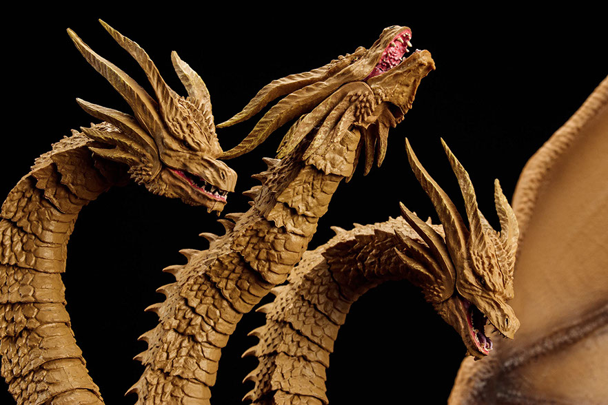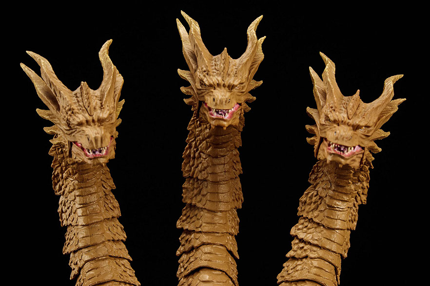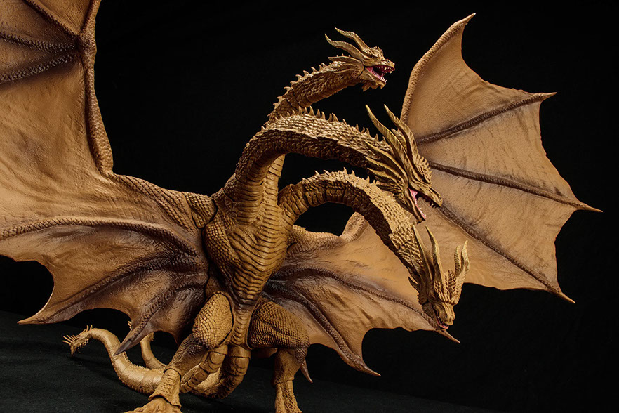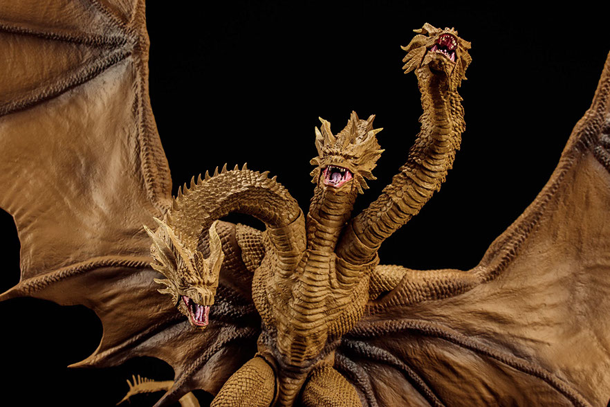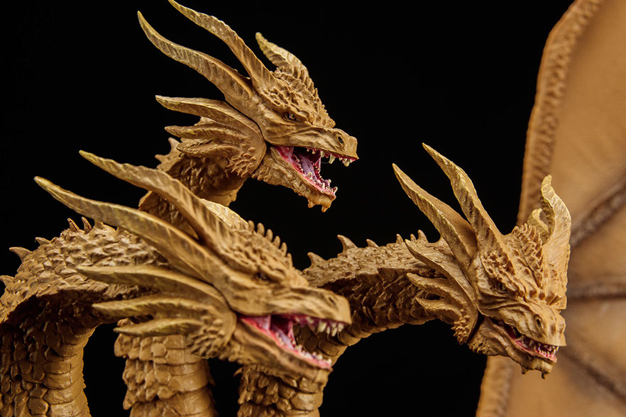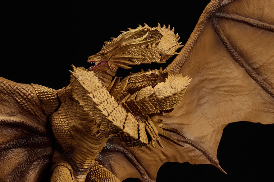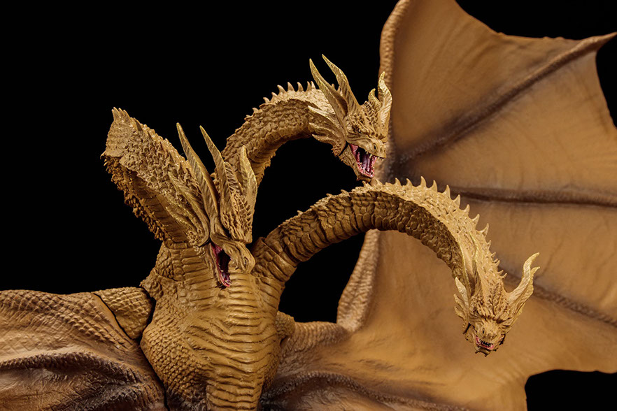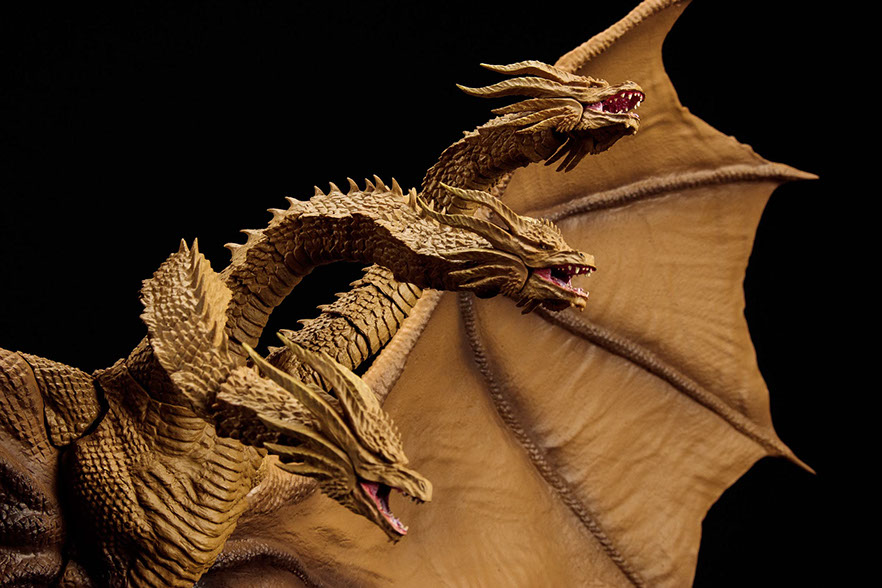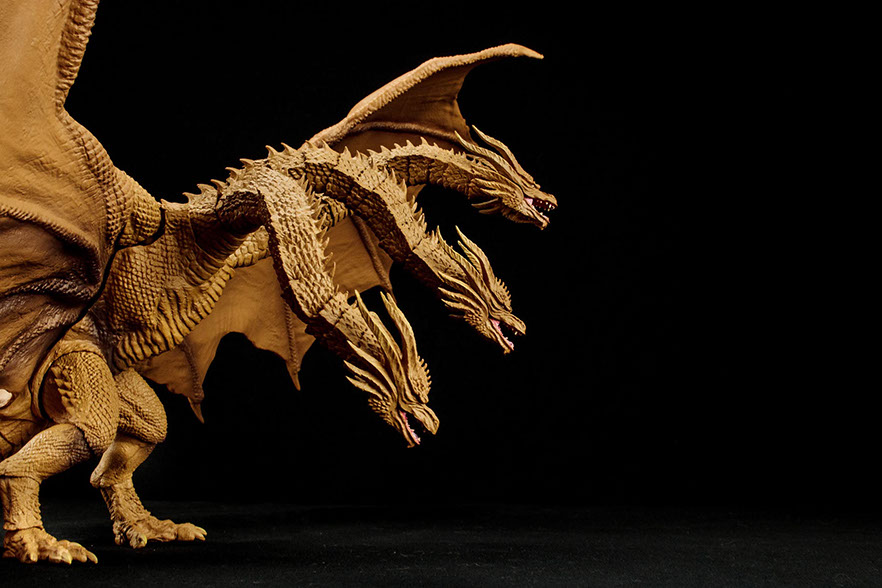S.H.MonsterArts King Ghidorah (2019) is literally a monster of a figure. It stands at 9.8 inches tall with a wingspan of nearly 24 inches! Finding shelf space for this piece is sure to cause some reorganization among some collectors. King Ghidorah, like Godzilla, utilized the 3D data from the film with additional sculpting by Shinichi Wakasa. However, once Godzilla: King of The Monsters (2019) hit the big screen, it was obvious that the final screen version differed from the materials Tamashii Nations was given during the time of production. Notable differences are in the size and shape of the necks and heads. Nevertheless, it still looks and feels like a good representation of King Ghidorah.