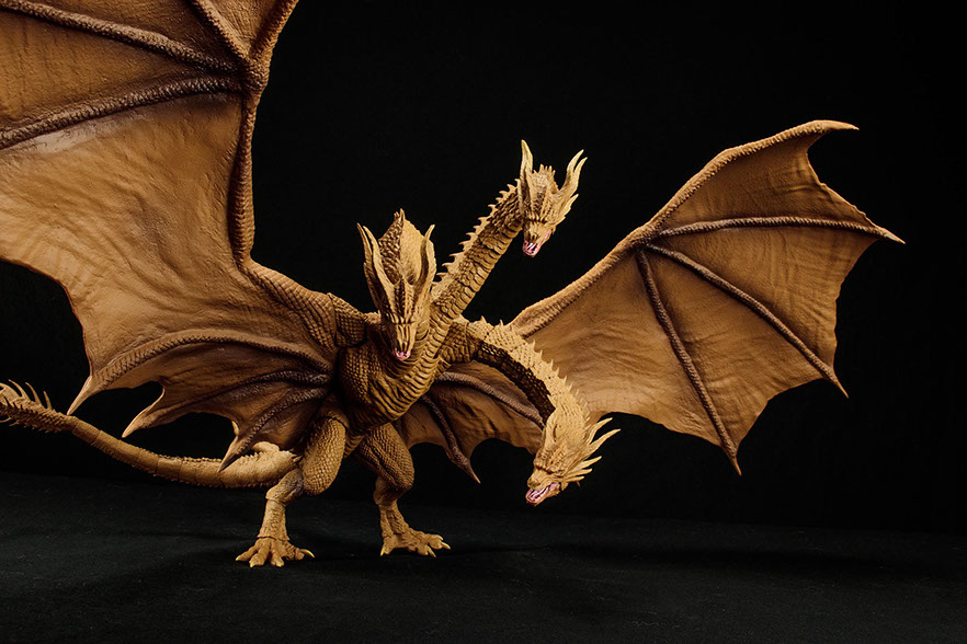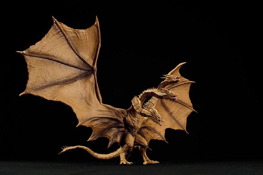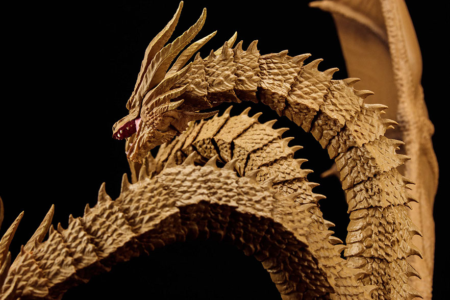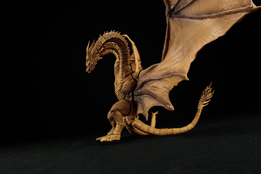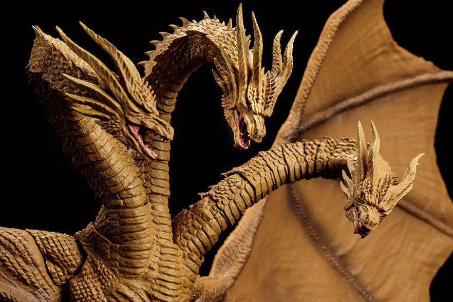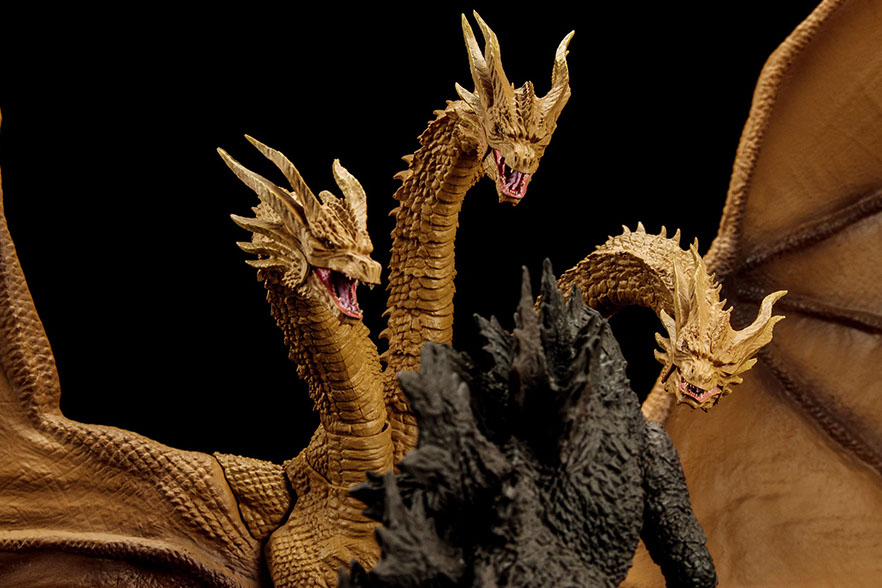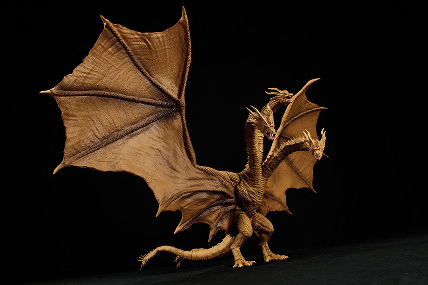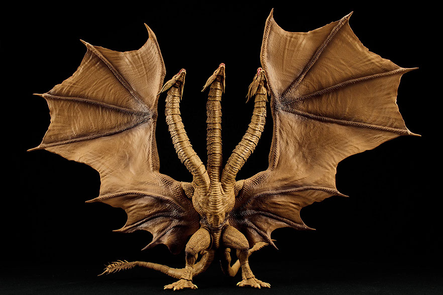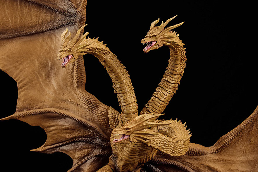 S.H.MonsterArts King Ghidorah (2019) is literally a monster of a figure. It stands at 9.8 inches tall with a wingspan of nearly 24 inches! Finding shelf space for this piece is sure to cause some reorganization among some collectors. King Ghidorah, like Godzilla, utilized the 3D data from the film with additional sculpting by Shinichi Wakasa. However, once Godzilla: King of The Monsters (2019) hit the big screen, it was obvious that the final screen version differed from the materials Tamashii Nations was given during the time of production. Notable differences are in the size and shape of the necks and heads. Nevertheless, it still looks and feels like a good representation of King Ghidorah.