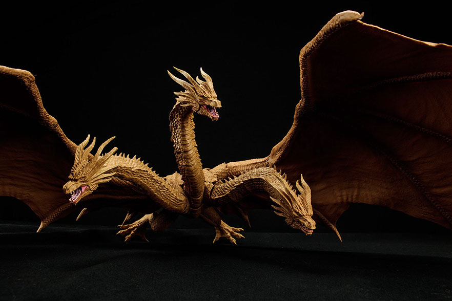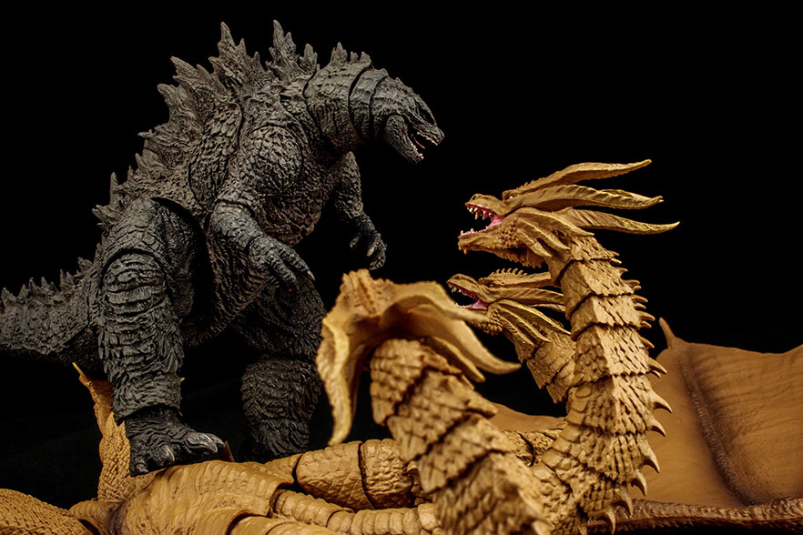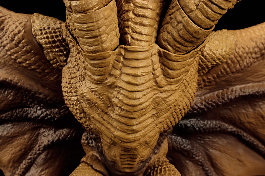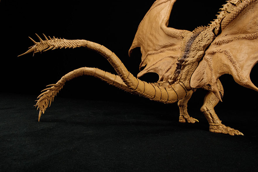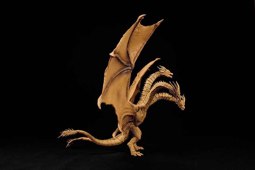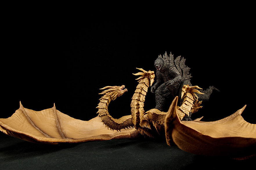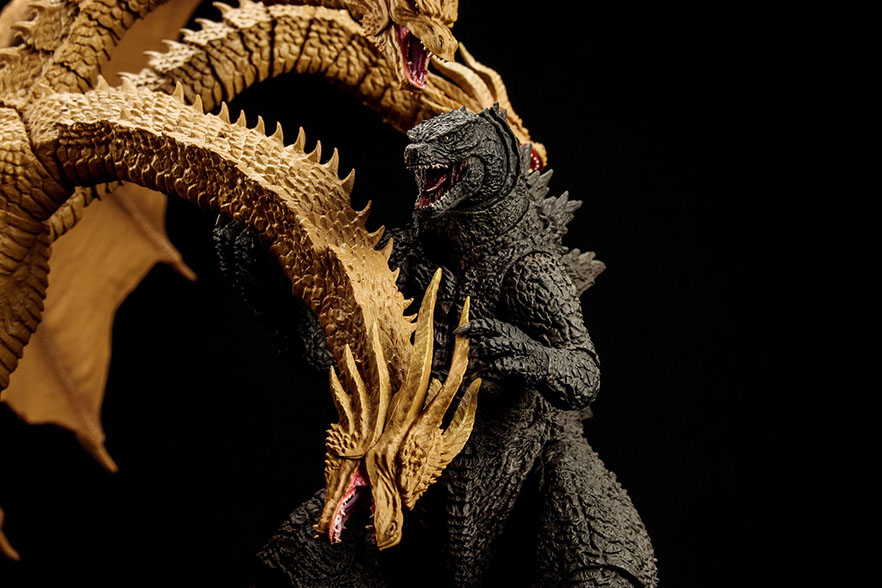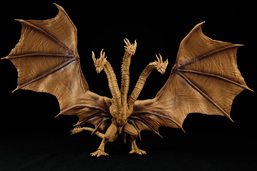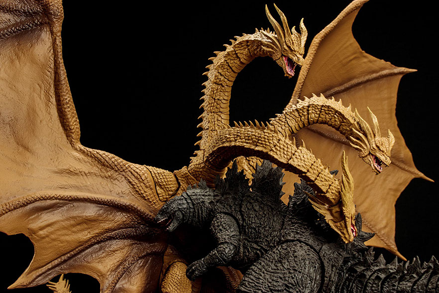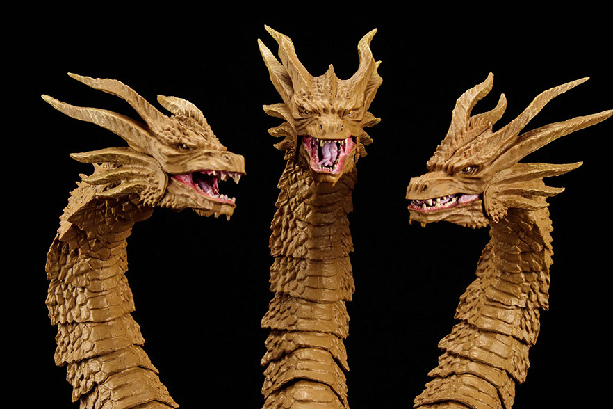S.H.MonsterArts King Ghidorah (2019) is literally a monster of a figure. It stands at 9.8 inches tall with a wingspan of nearly 24 inches! Finding shelf space for this piece is sure to cause some reorganization among some collectors. King Ghidorah, like Godzilla, utilized the 3D data from the film with additional sculpting by Shinichi Wakasa. However, once Godzilla: King of The Monsters (2019) hit the big screen, it was obvious that the final screen version differed from the materials Tamashii Nations was given during the time of production. Notable differences are in the size and shape of the necks and heads. Nevertheless, it still looks and feels like a good representation of King Ghidorah.