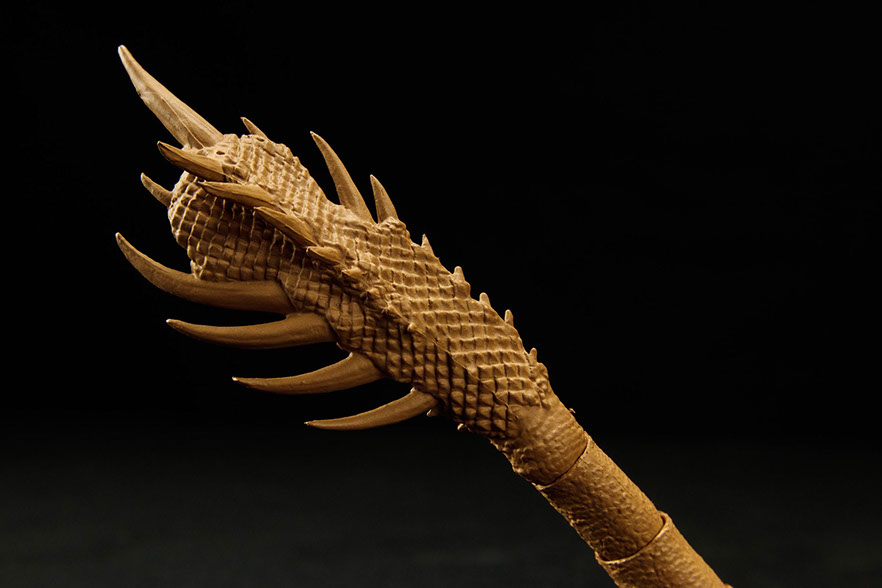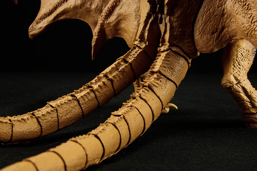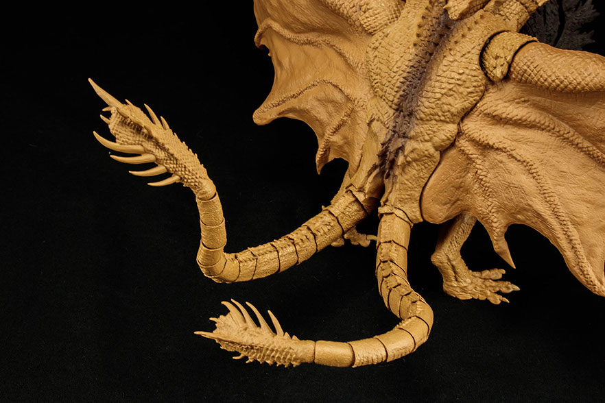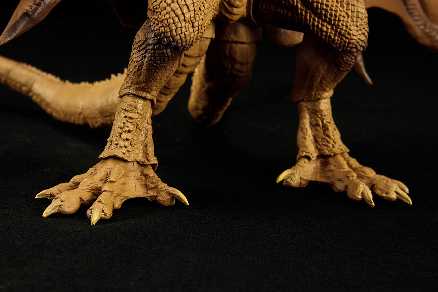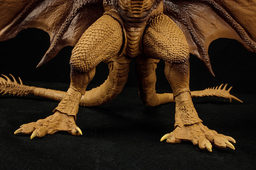 The creatures design does not lend itself well as an articulated figure as the proportions of the wings are massive and heavy compared to the body. While it can move, holding a pose can be challenging if not aggravating. Tamashii Nations did include a trio stand system to better support the figure, but using these will limit some dynamic posing. The neck articulation works quite well and can get some serious range and twisting. Same for the tails; they have a decent amount of movement and can easily wrap around Godzilla. The wings can move back and forth, it is limited though when compared to the Heisei King Ghidorah. However, these wings have a unique function to pose upwards in the air to replicate its intimidating pose seen from the movie. The stands provided can hold his pose long term. The mouths utilize a bizarre form of articulation where they're on a peg inside the mouth with the lower jaw sliding into the head. This results with some crooked mouths, but can be remedied with a the heat from a hair dryer. This is also the first bipedal figure in the S.H.MonsterArts line, so it is interesting to see how the articulation works and how well it can hold up the figure. They have some good range, but aren't as dynamic as one would think. There is no torso articulation, which is understandable given the weight of the wings.
