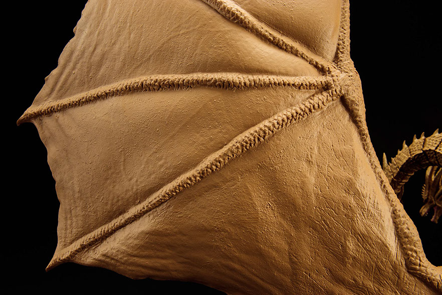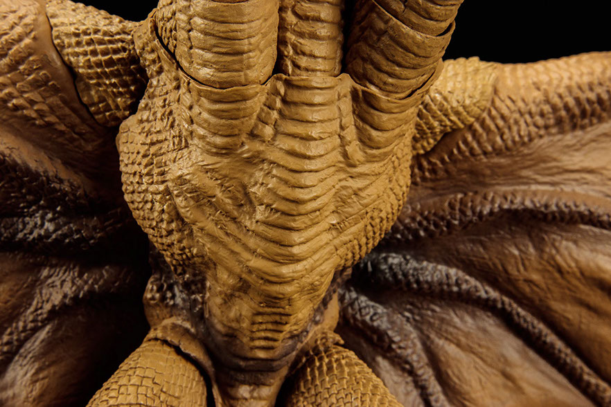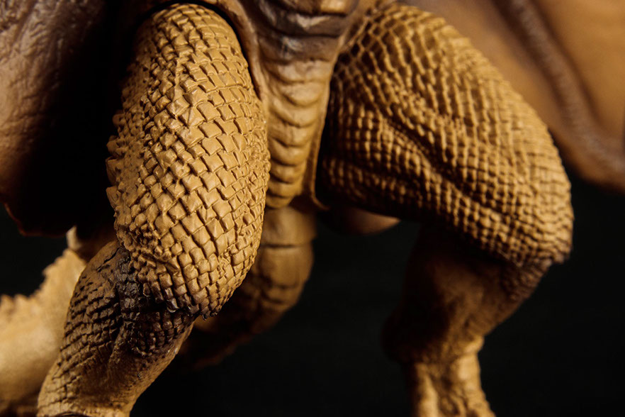 The paint application falls flat when compared to the promotional pics. Upon opening the box the figure is a beige tan-ish color which just feels off. Though it's hard to say if it is truly accurate as Ghidorah is constantly shrouded in weather fx in the film. Interestingly, using studio lights or even sunlight, the figure's paint application appears closer to the promo pictures. Perhaps this is the trick of this paint application? Many may customize and repaint theirs gold. Some are holding out for a repaint <don't hold your breath to long>. I enjoy it for what it is, but I do wish that it was more golden... There is also no shading on the back of the wings, which was a design decision from the beginning. The eyes and mouth's are painted well.