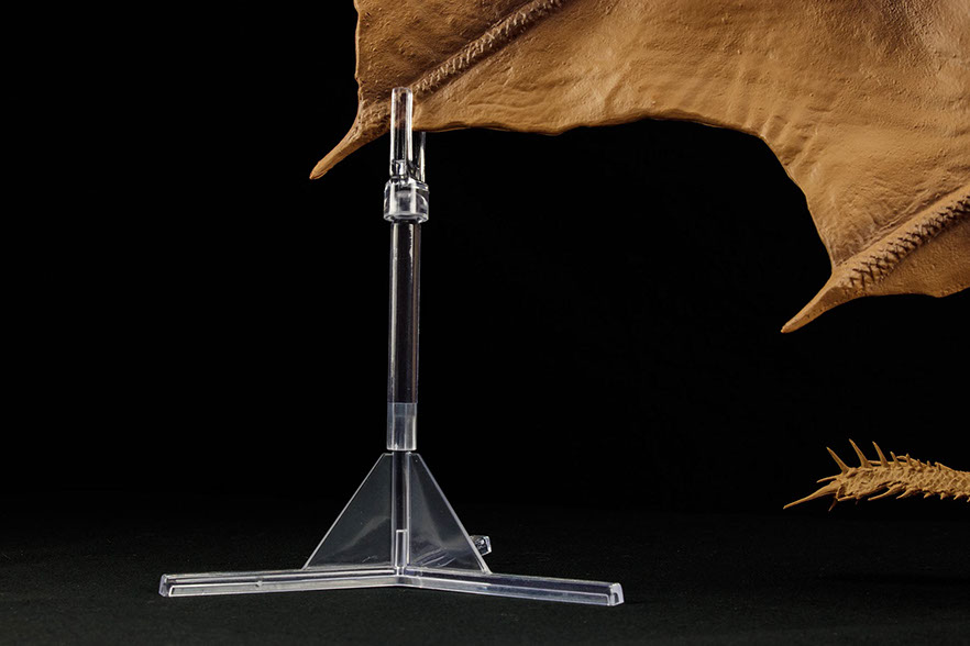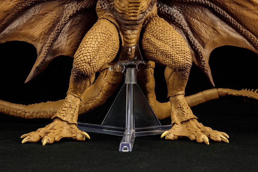 As far as accessories go, King Ghidorah comes with a trio stand system. Two stands for the wings with a support. The rods for the with wings have a ball joint tip so that the support can be moved at different angles to better support the figure. For the best support, a cradle stand for the crotch area. No beam effects were included (keeping costs down). However if you have have the Heisei King Ghidorah beams effects, they work quite well!